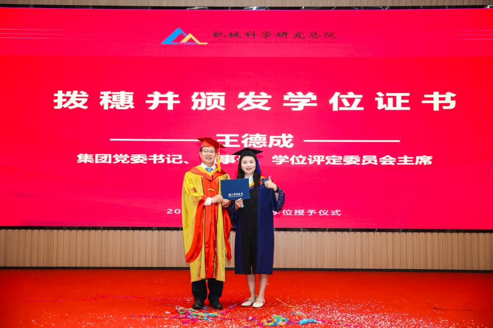 李愛國宣讀了《機械科學研究總院2025屆畢業生學位授予決定》,王德成為每位畢業生撥穗正冠并頒發學位證書。