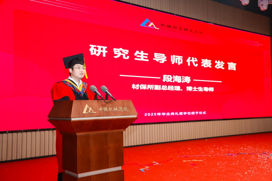 材保所副總經理、博士生導師段海濤作為導師代表發言,為全體畢業生送上囑托和期望。他希望同學們樹立“大志向”、堅守“大擔當”、秉持“大情懷”,用真才實學鐫刻屬于自己的璀璨印記。